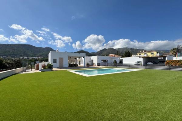 Villa en una sola planta con 4 dormitorios más apartamento de invitados. Mantenimiento del jardín y piscina incluido en el precio.