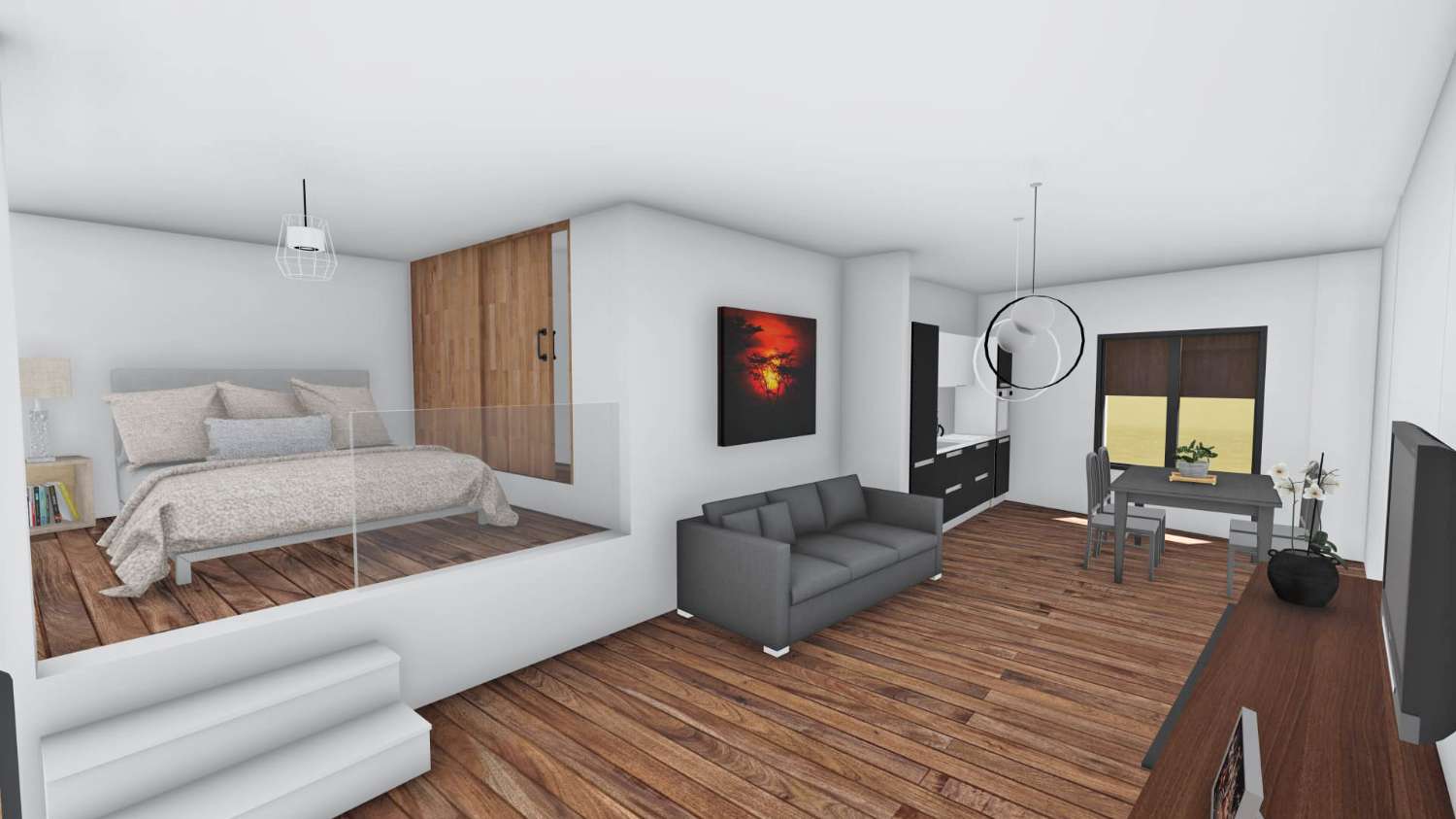 Sus 51,40m2 construidos y 42m2 útiles que se distribuyen: Baño exterior de 2,70m2 y el resto diáfano, con un espacio de 10m2 en doble altura con armarios empotrados preparado para ser el espacio de dormitorio.