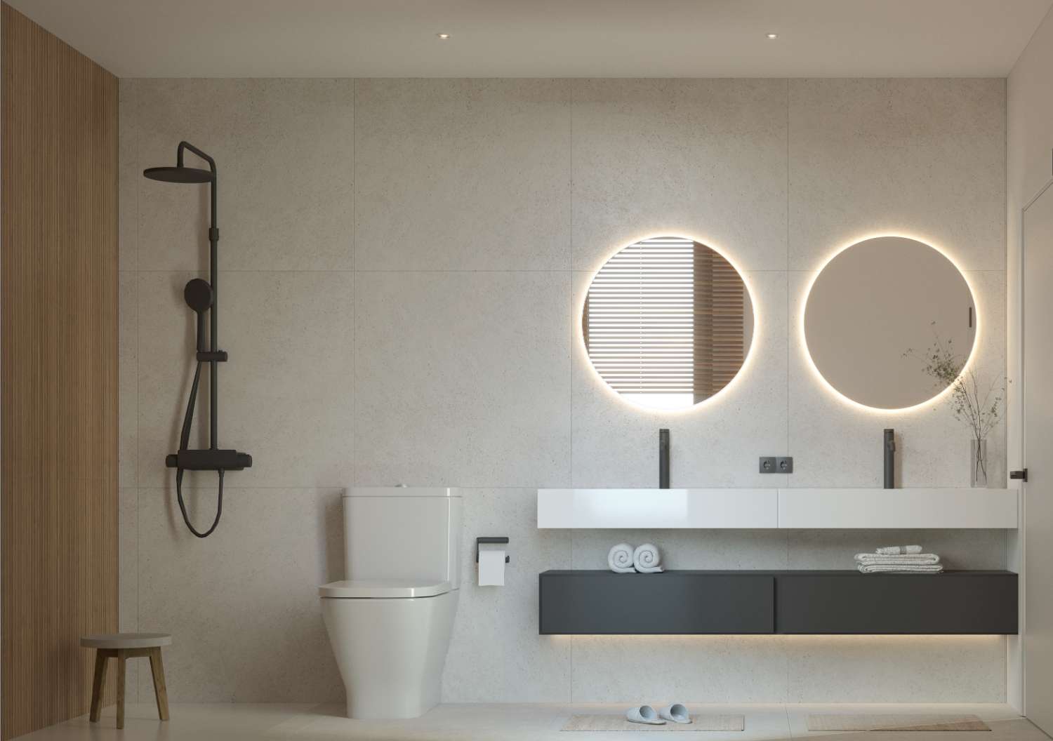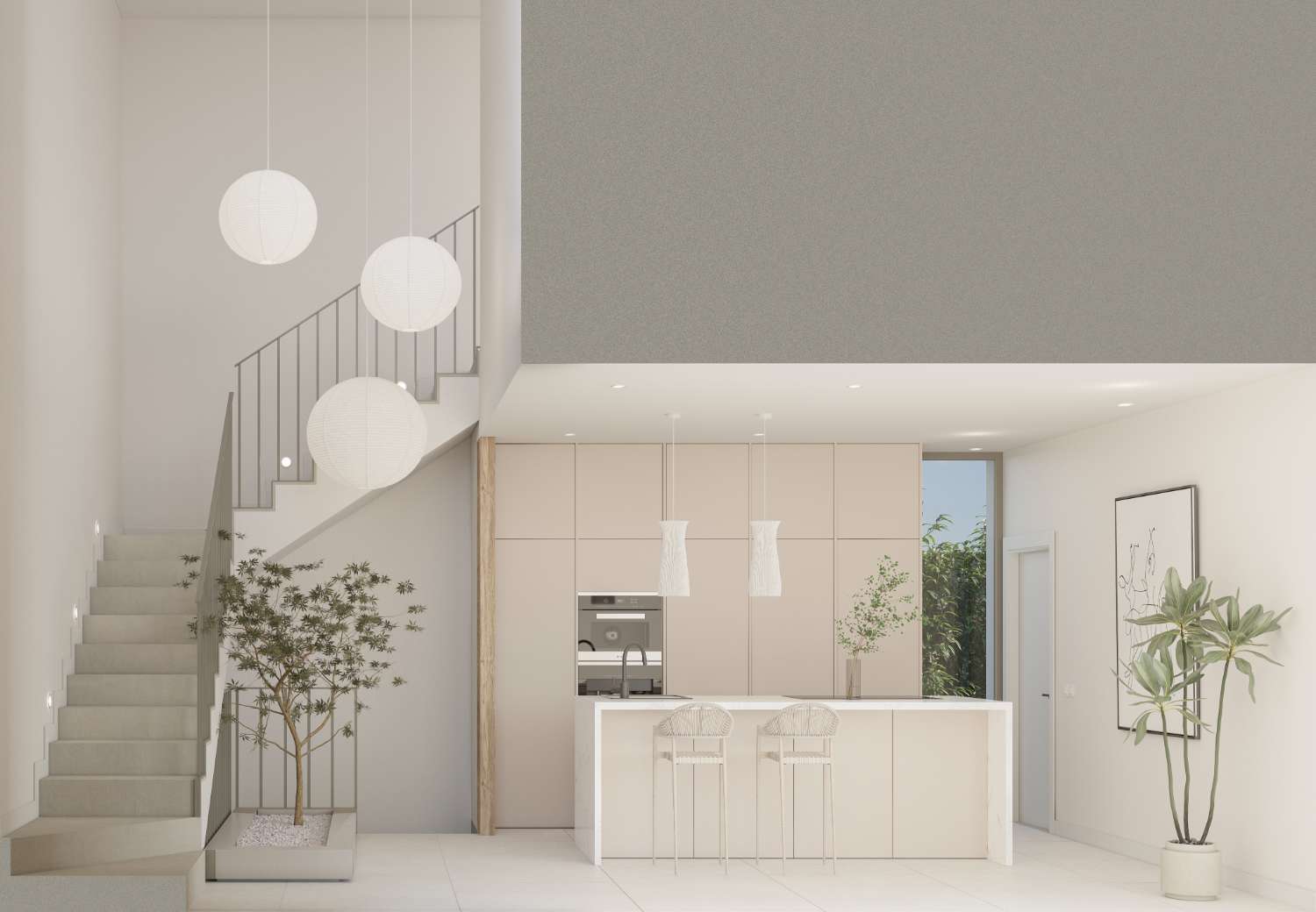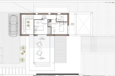 - Suelos y alicatados: Suelos de gres porcelánico de 1ª calidad o tarima flotante. En baños alicatado porcelánico de 1ª. Pavimiento exterior en gres de 1ª y hormigón impreso.