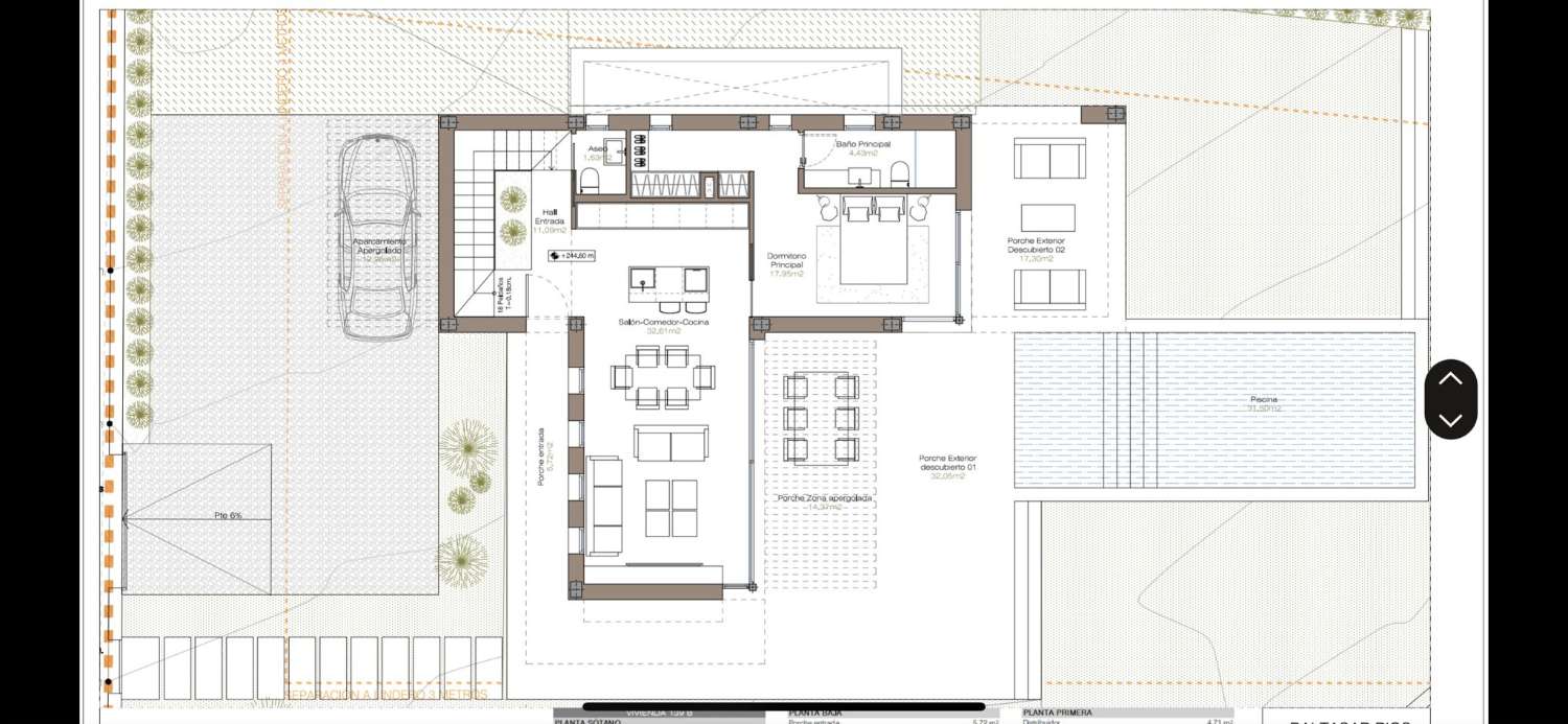 PLANTA BAJA: Hall, salón-comedor con cocina abierta, dormitorio principal, vestidor, baño, aseo y porche.